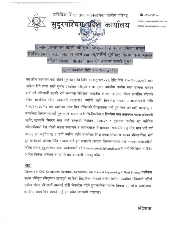 डिप्लोमा/प्रमाणपत्र तहको वर्गीकृत (नि:शुल्क) छात्रवृत्ति तर्फका सम्पूर्ण कार्यक्रमहरुको रिक्त कोटाको लागि कट अप/उत्तीर्ण सूचीबाट योग्यताक्रम अनुसार नतिजा प्रकाशन गरिएको सम्बन्धी अत्यन्त जरुरी सूचना २